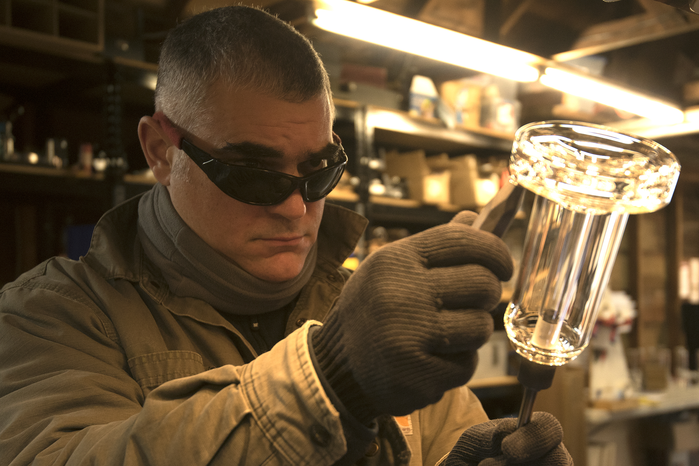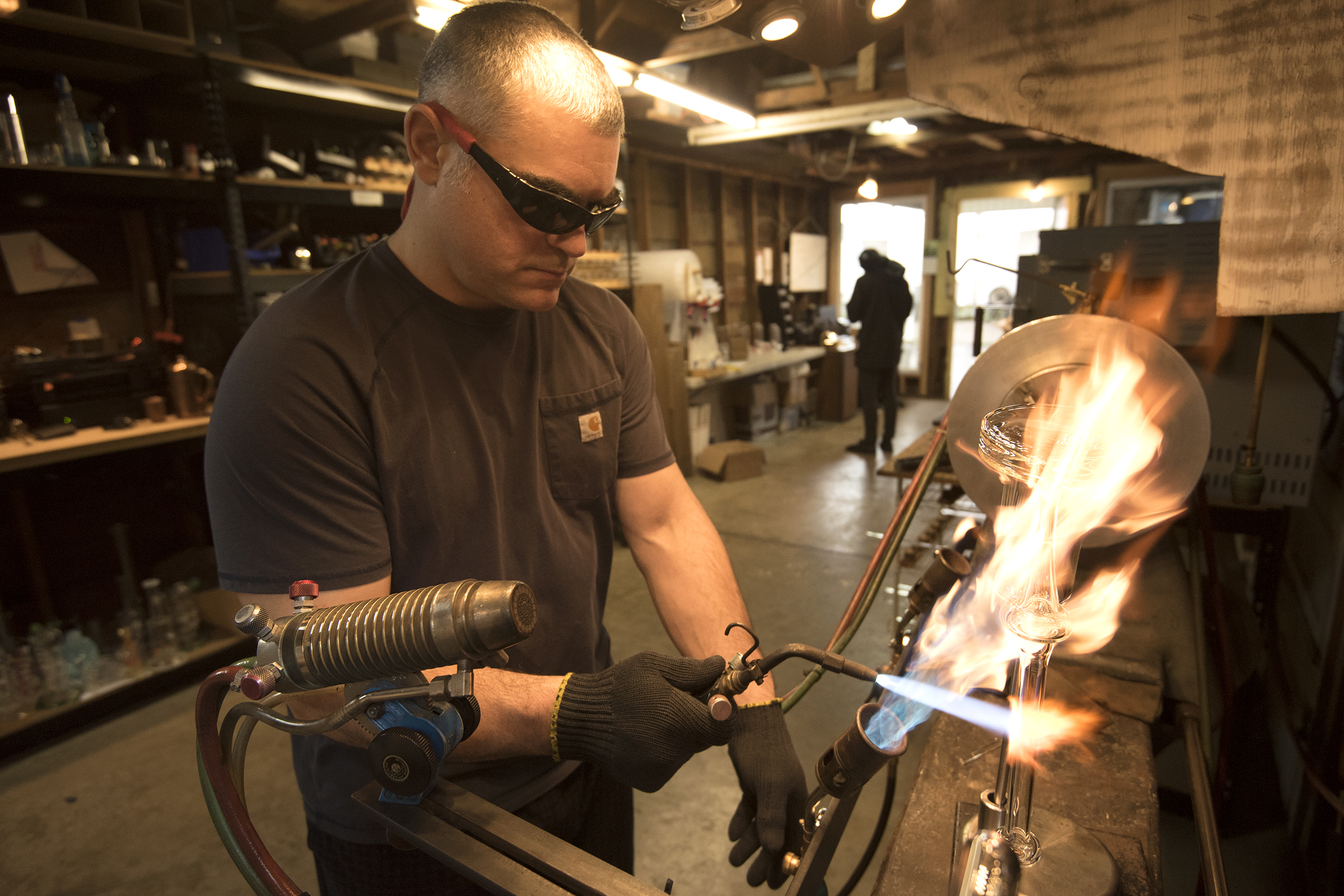 Bundled up in layers, Sky Cooper repairs a customer’s broken water pipe from the workshop located in the backyard of his humble Eugene home. He doesn’t mind braving the chilly winter days for the sake of his art, which just so happens to be his full-time job. Forty-four-year-old Cooper has been working as a glass blower for twenty-three years, but it hardly feels like work to him anymore. “You really don’t feel like you’re working when you love what you’re doing,” Cooper acknowledges. In his case, there is nothing else he would rather be doing.