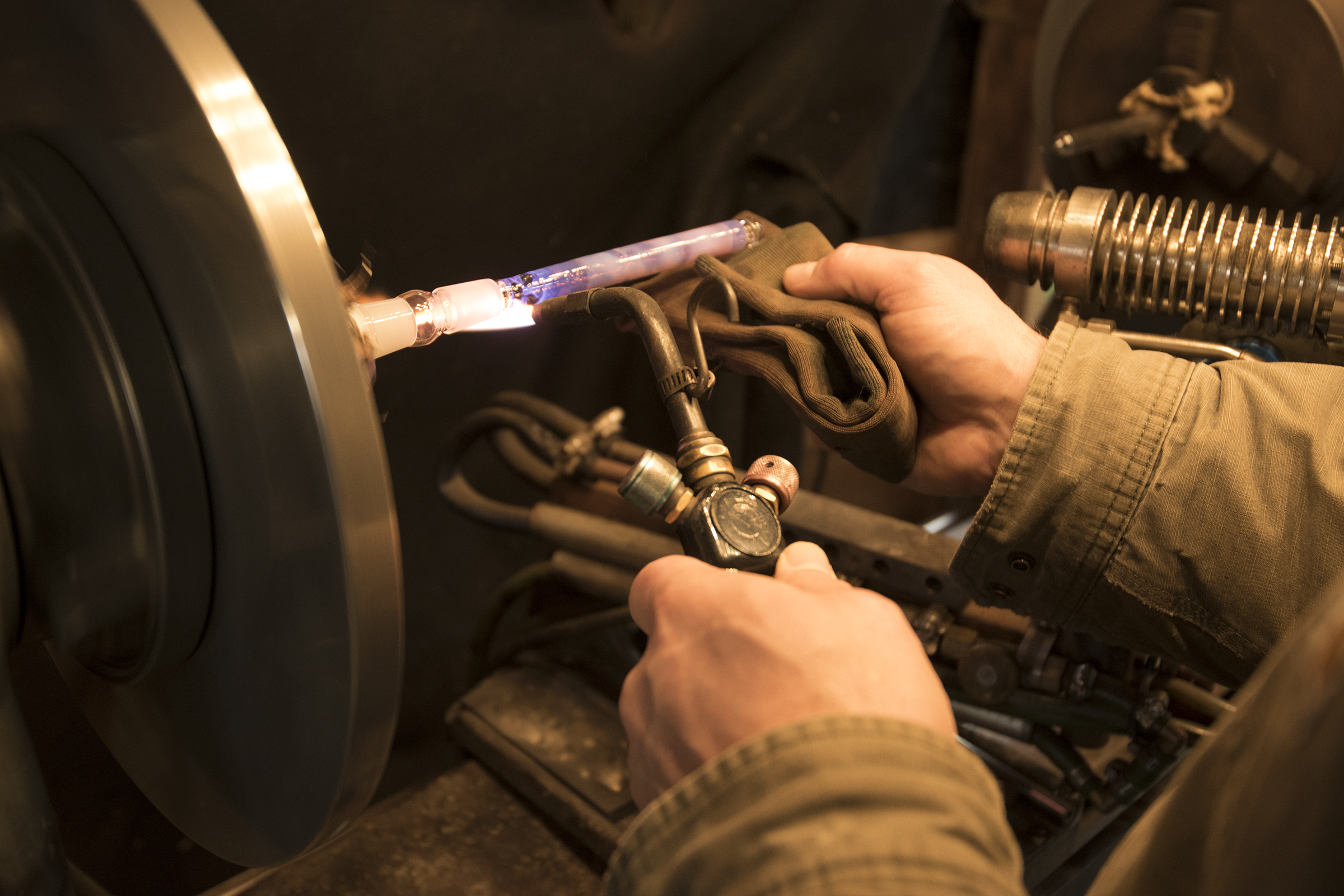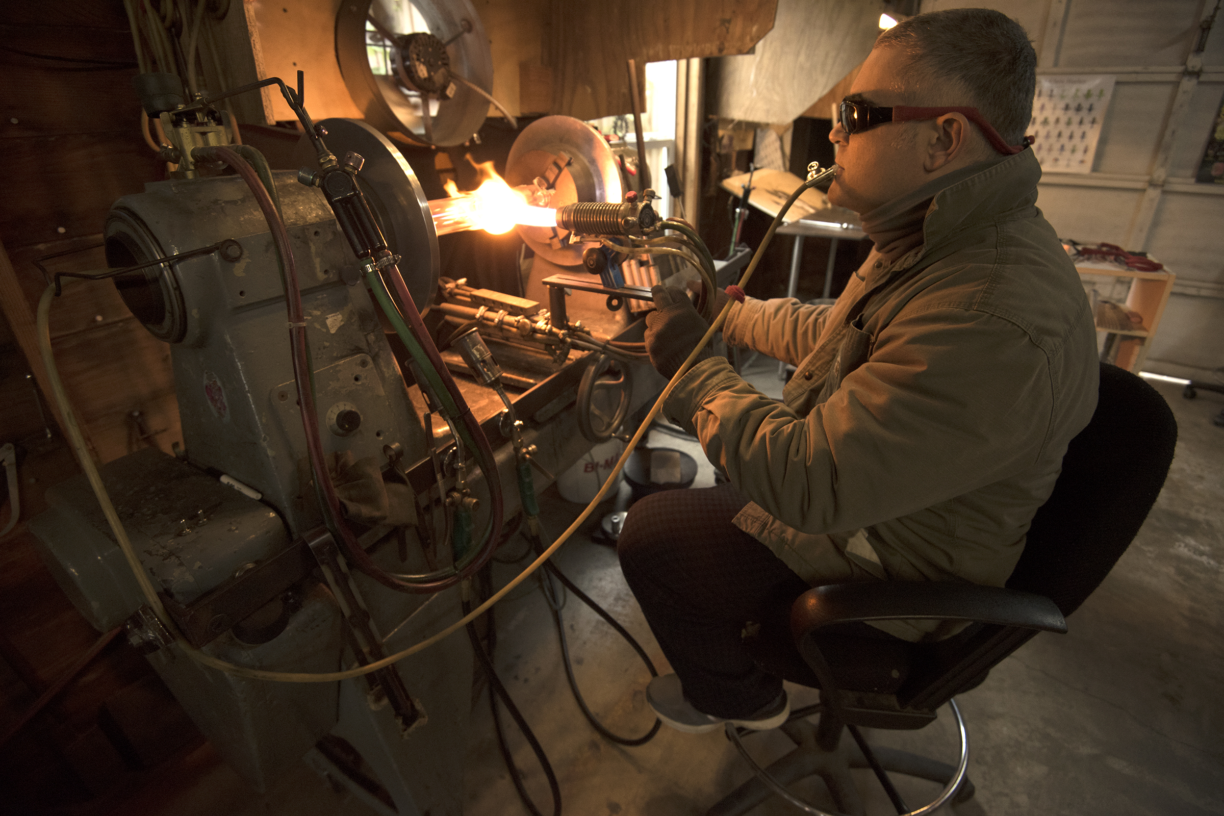 Meticulously peering over the top of his safety glasses, Cooper adds final details to the pipe’s base using a carbon graphite rod. Because glass blowing is such a scrupulous process, it takes an experienced glass blower to produce pieces as quality as the ones Cooper makes. He mentions that Glass blowing has many safety precautions and requires very specific equipment. The glasses protect his eyes from ultraviolet and infrared lights emitting from the glass blowing process; without them, his eyes would be damaged with prolonged exposure. The shaping tool is made of graphite specifically because the mineral does not melt or stick against the molten glass.