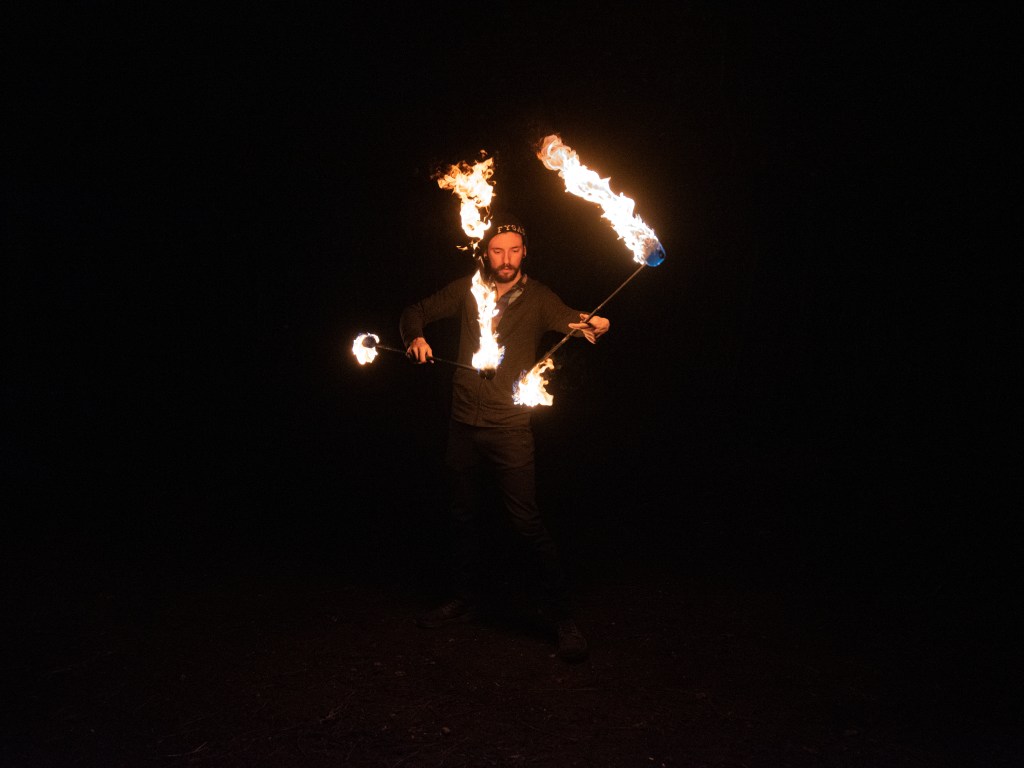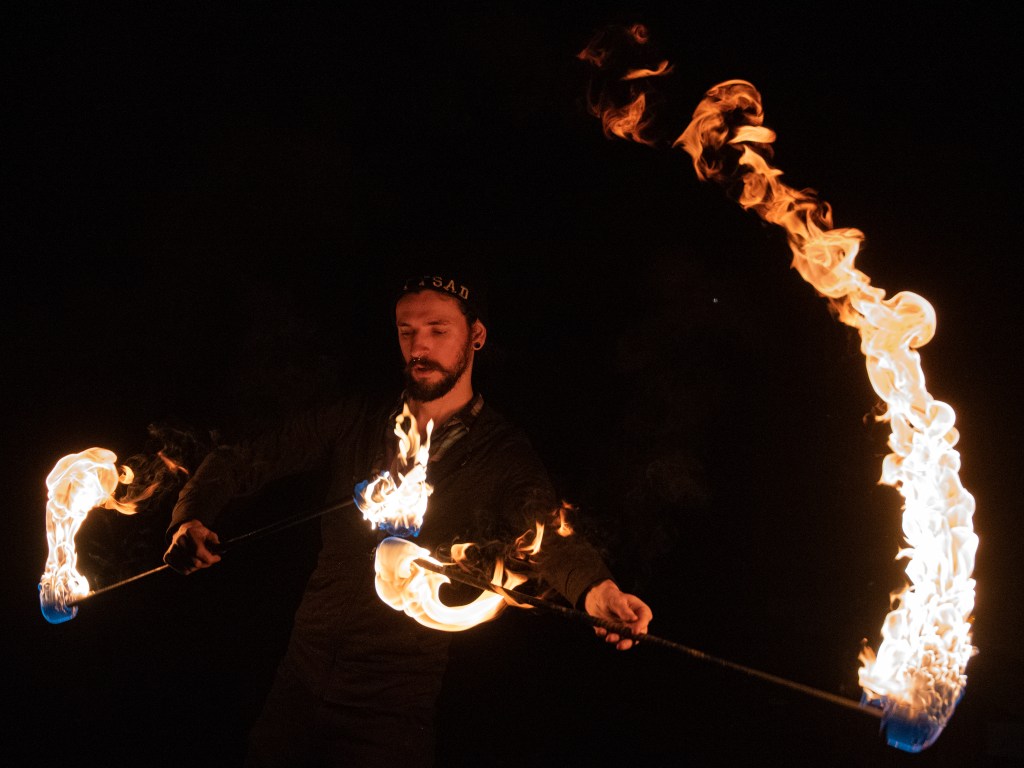 Experimenting with a new routine, Stephen O’Brien twirls a pair of his friend’s double fire staff just before midnight. O’brien shares that he would rather double wield because he “loves the intricate patterns he can create with smaller staffs.”