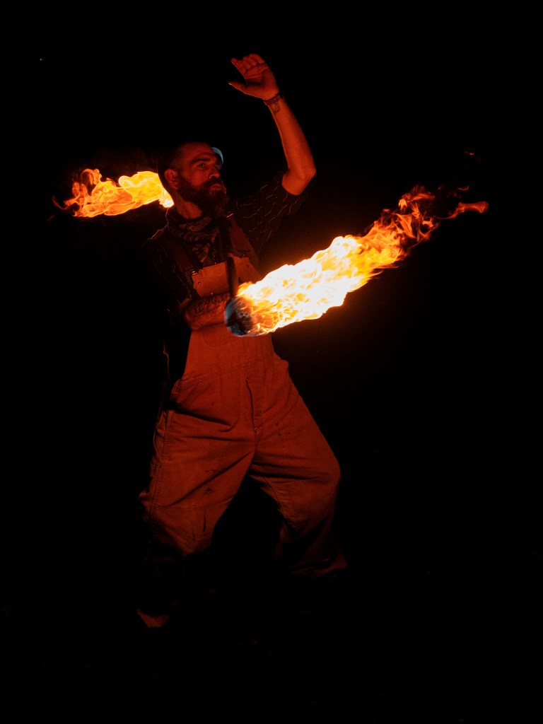 O’Brien joins fellow fire performers at Dew Drop Inn or Washington Jefferson St. Bridge Park every Thursday night to enjoy House music and practice spinning together. O’Brien started spinning LED staffs at music festivals when he was 18, but once he was introduced to fire spinning two and a half years ago he’s been playing with fire ever since